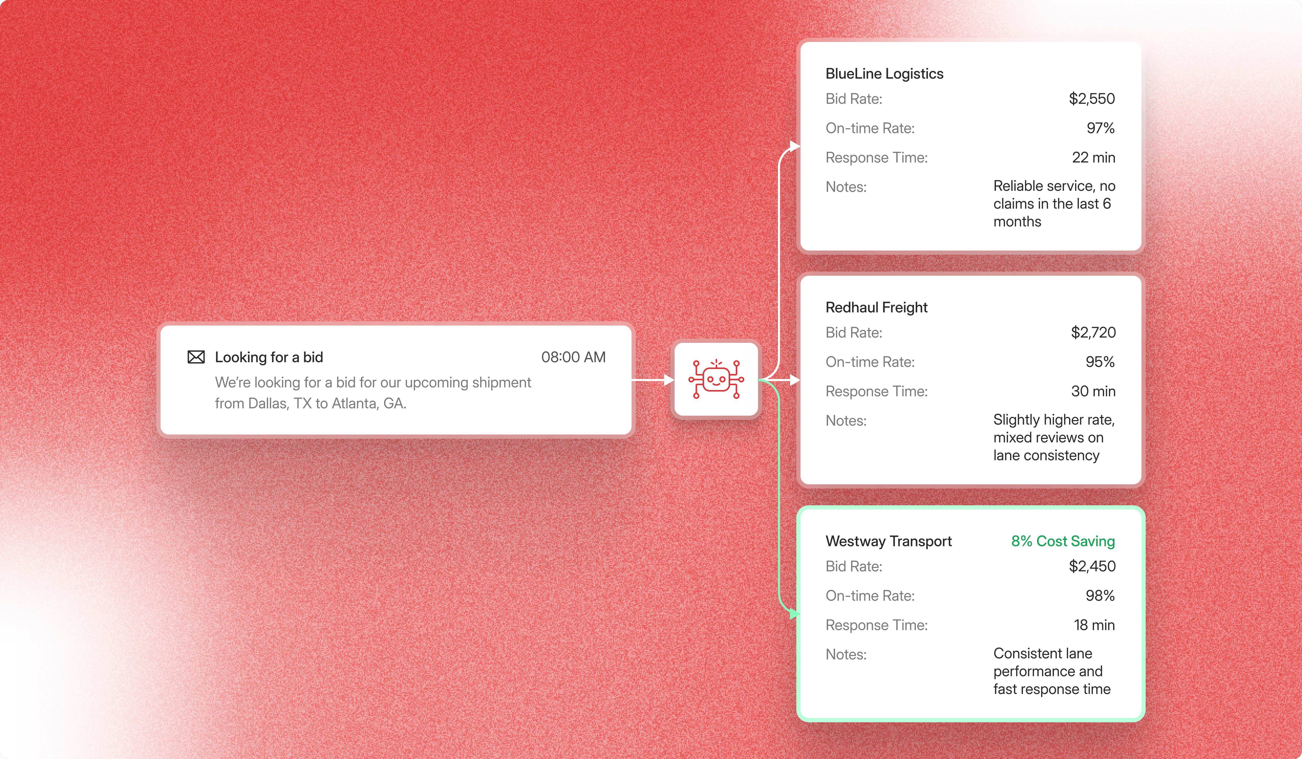 Automates email outreach, collects responses, analyzes rates, performance, claims, and invoicing - awarding optimal carriers in hours, not weeks.