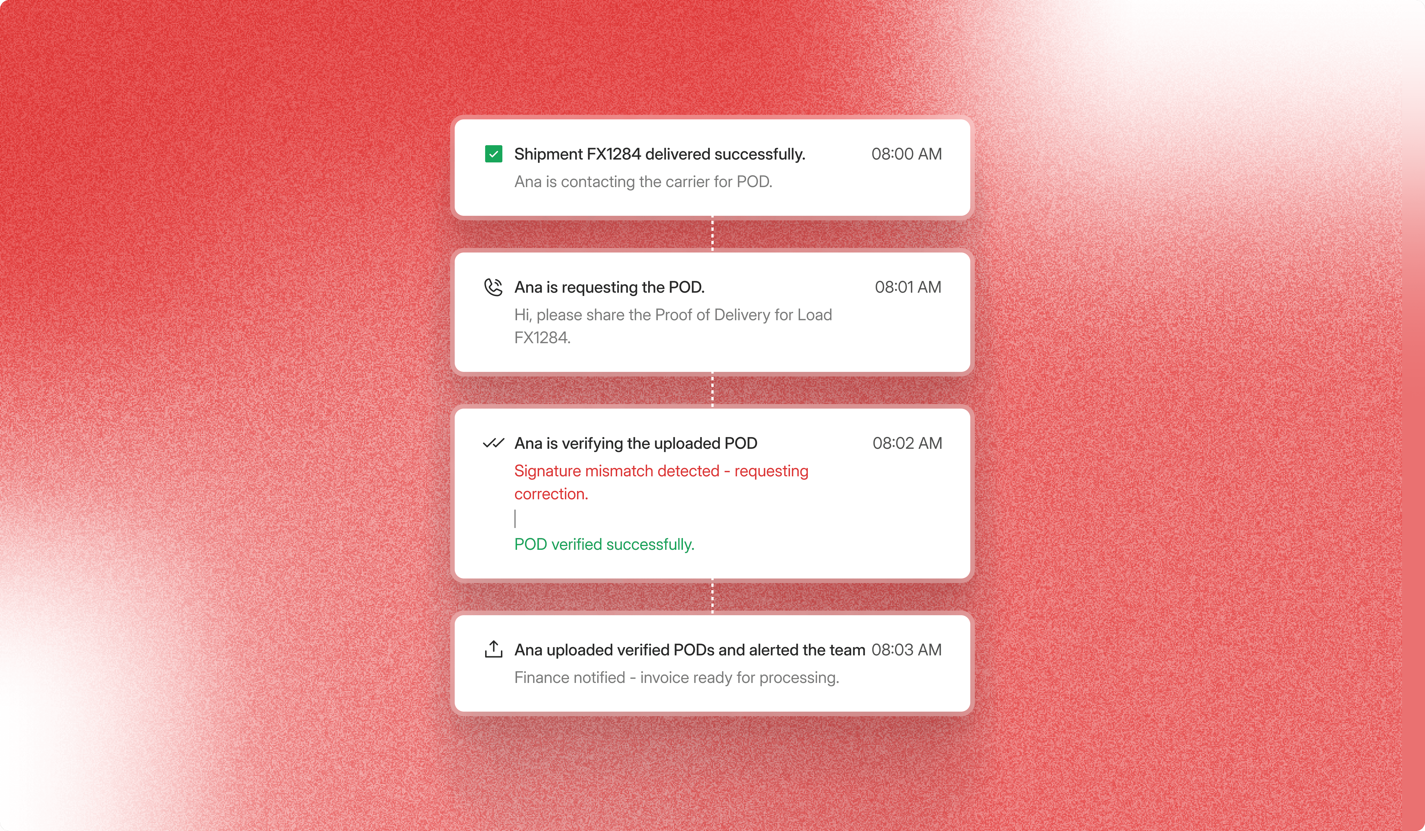 Ana instantly contacts carriers when shipments are delivered via email, text or phone call, verifies POD accuracy, requests corrections if needed, uploads only accurate PODs to TMS, and notifies finance—fully automating your freight workflow.