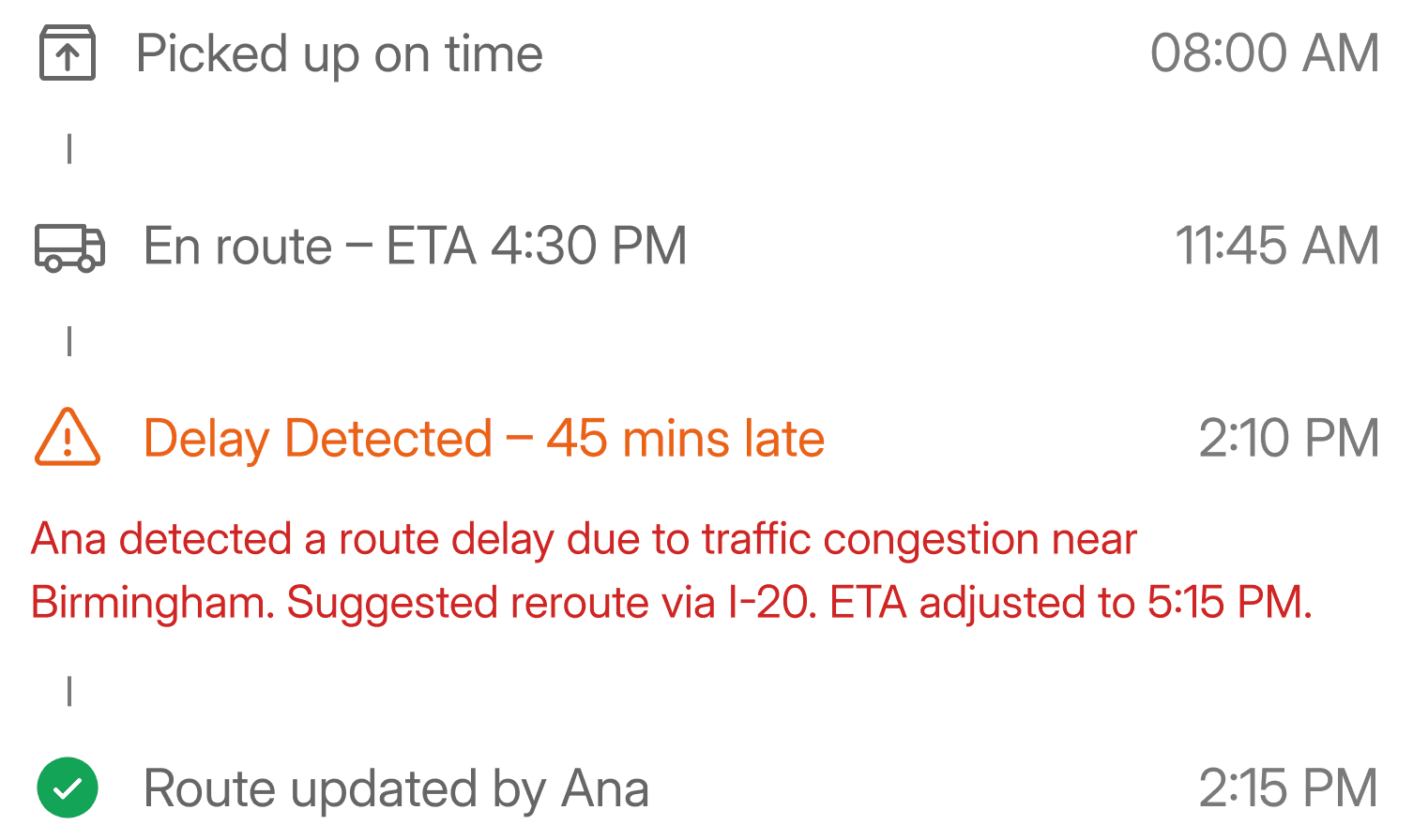 Ana monitors ELD/app based tracking updates in real-time, and auto-emails or calls carriers or brokers for instant corrections—deliver proactive reliable customer service with every shipment.